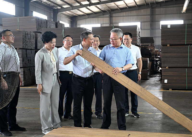 2025年6月16日,省政協(xié)副主席虢正貴來湖南桃花江竹材科技股份有限公司調(diào)研生態(tài)資源轉(zhuǎn)化與特色產(chǎn)業(yè)融合發(fā)展。公司董事長、省人大代表薛志成陪同并介紹情況。虢正貴充分肯定了桃花江竹材在竹資源利用及竹特色產(chǎn)業(yè)融合發(fā)展所取得的成果,他鼓勵(lì)企業(yè)繼續(xù)發(fā)揮龍頭優(yōu)勢,充分利用好桃江資源稟賦和產(chǎn)業(yè)優(yōu)勢,深化產(chǎn)學(xué)研融合,提升竹產(chǎn)業(yè)附加值,為民族地區(qū)生態(tài)資源高效轉(zhuǎn)化和特色產(chǎn)業(yè)融合發(fā)展探索更多經(jīng)驗(yàn)。